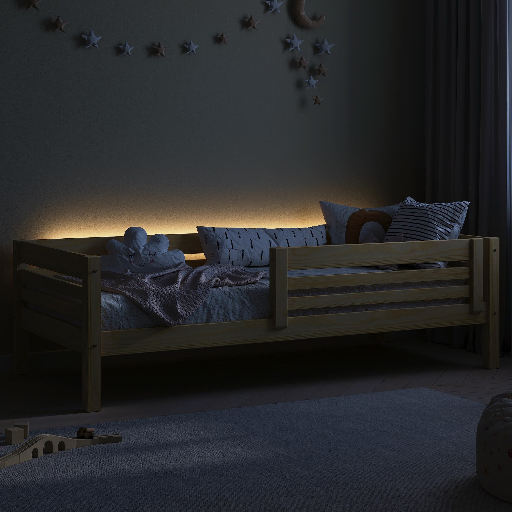 Gefertigt aus massivem Holz mit fein gemessenen Oberflächen, überzeugt dieses Bett durch seine solide Bauweise und hochwertige Optik. Das integrierte Schutzgeländer bewahrt insbesondere lebhafte Kinder nachts zuverlässig vor dem Herausfallen. Dank der robusten Ausführung trägt das Bett bis zu 120 kg – ideal auch für gemeinsame Abendstunden mit dem Kind.