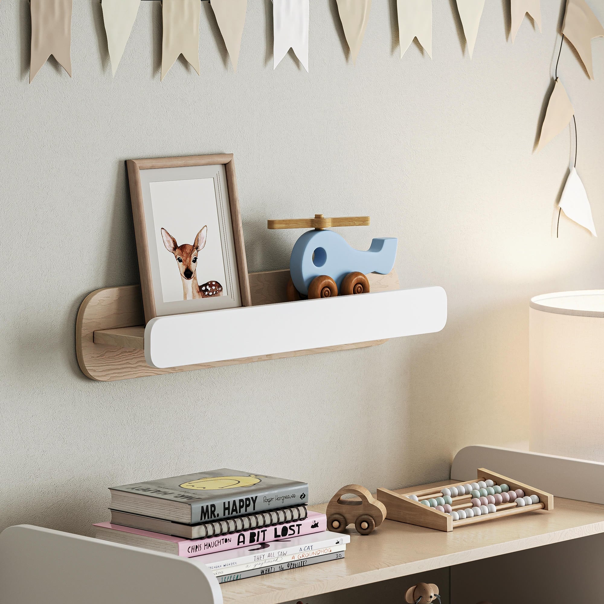 Das MOMO Mini-Regal ist ein kleines, aber ungemein nützliches Einrichtungsdetail. Es lässt sich bequem am Kopfende eines Bettes platzieren, neben einem Tisch aufhängen oder als Wandorganisator für Ihre liebsten Kleinigkeiten verwenden - Bücher, ein Nachtlicht, eine Superheldenfigur, eine Puppe oder ein Glas Wasser.