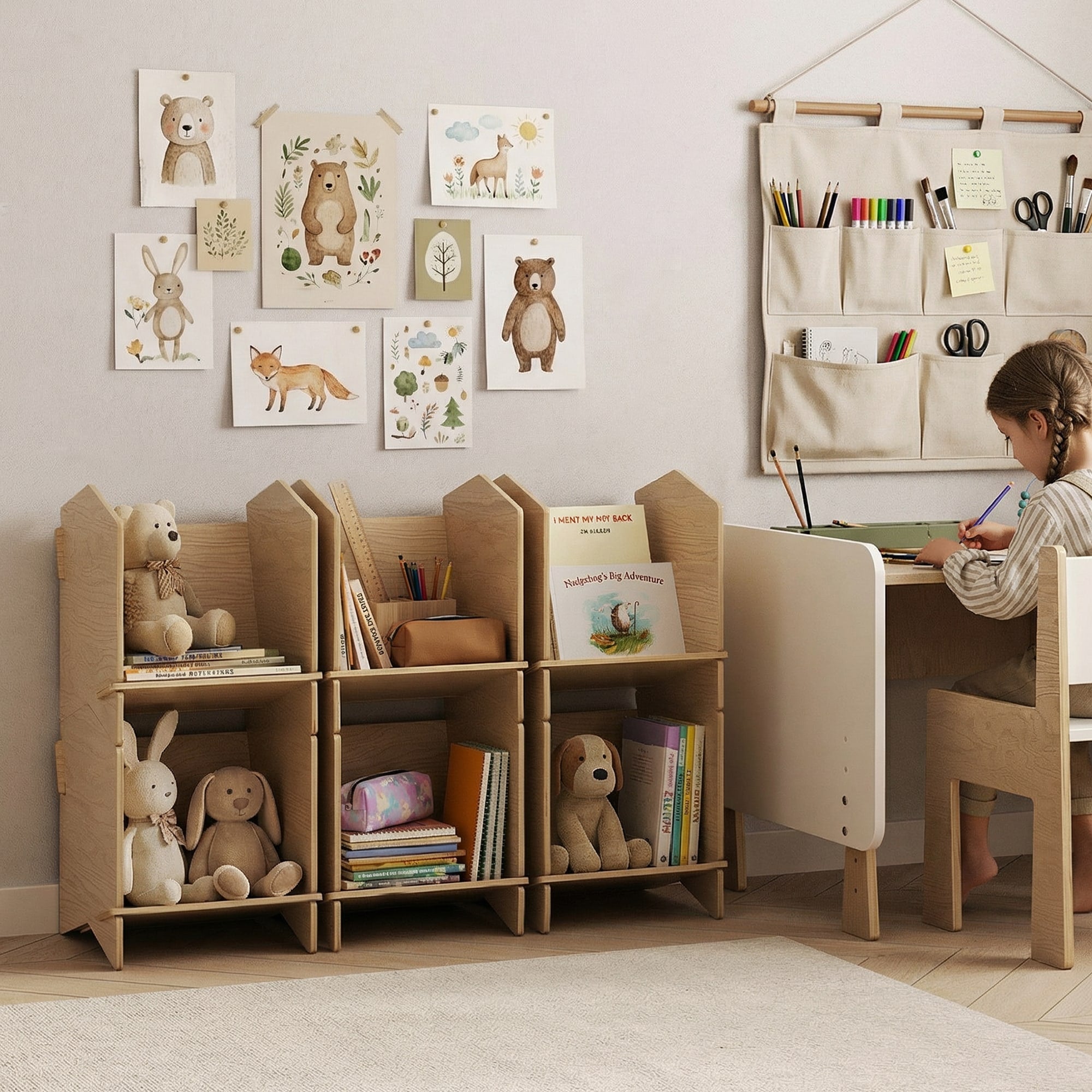 Dank des modularen Designs lassen sich mehrere Regale flexibel zu einem individuellen System kombinieren. Unterschiedliche Farben und Anordnungen ermöglichen es, das Regal perfekt an den Raum und die sich verändernden Bedürfnisse Ihres Kindes anzupassen.