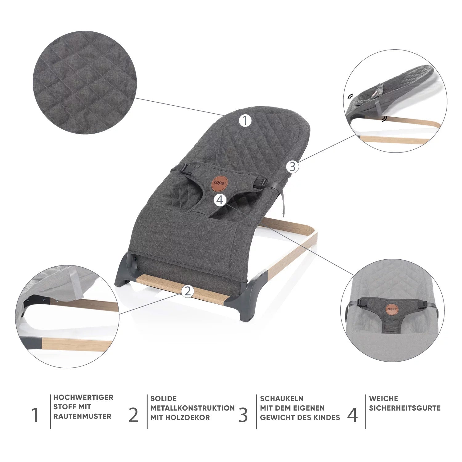 Die Wippe ist leicht, mobil und einfach zu transportieren. Das moderne Design mit Holzdekor integriert sich harmonisch in jedes Zuhause. Die Montage ist unkompliziert. Die Babywippe erfüllt die Sicherheitsnorm EN 12790.