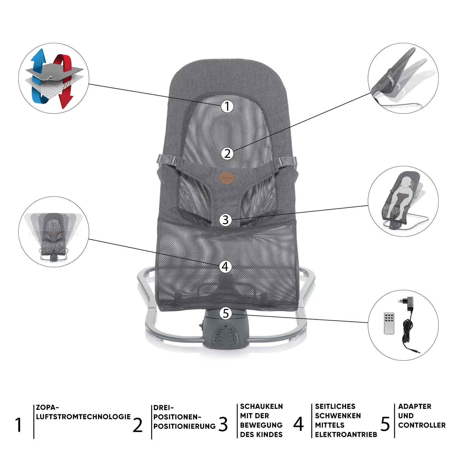 Die stabile Metallkonstruktion gewährleistet sicheren Stand und zuverlässige Unterstützung beim Schaukeln. Weiche Gurte sorgen für maximalen Schutz des Kindes. Die Wippe verfügt außerdem über eine automatische Startfunktion, die bei Bewegungserkennung des Kindes aktiviert wird. Bedient werden kann sie über das integrierte Bedienfeld oder die mitgelieferte Fernbedienung.