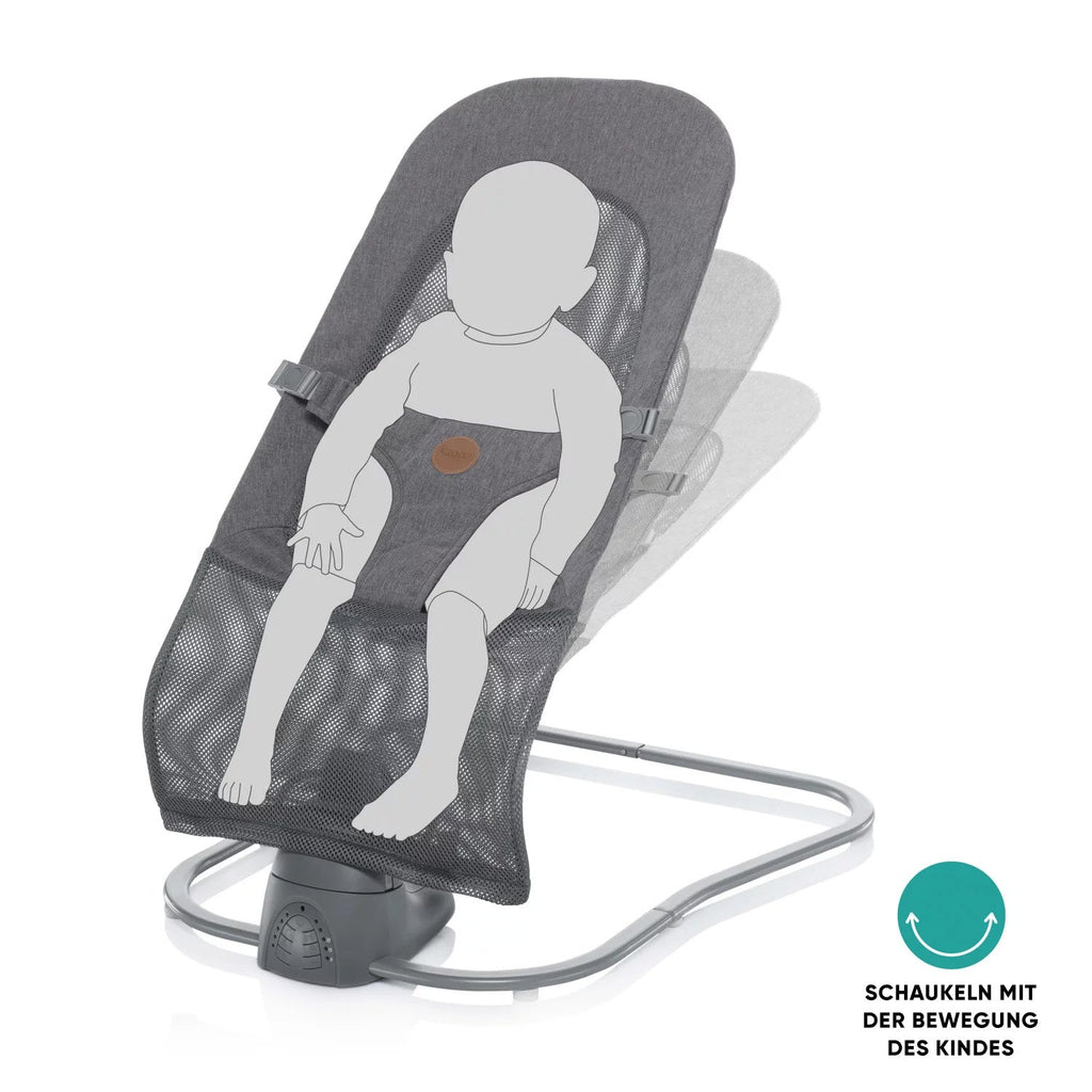 Robuste Metallkonstruktion, hochwertiger Bezug mit atmungsaktivem Mesh, 3 verstellbare Neigungswinkel, Melodien, automatische Startfunktion, Timer, Fernbedienung, leicht zusammenklappbar – das ist die Babywippe Moyo Air.