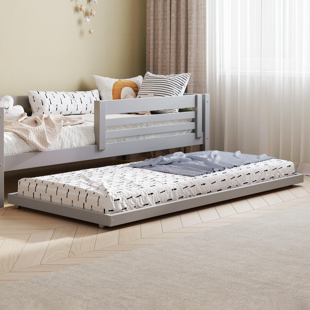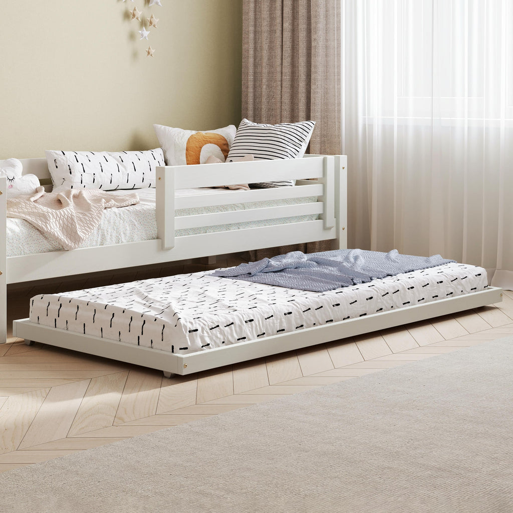 Entdecken Sie eine durchdachte Schlaflösung: Das Pull-out Trundle Bed TOTO von BusyKids bietet zusätzlichen Komfort – als Gästebett, für gemeinsame Schlafmomente oder als Erweiterung Ihres Kinderzimmers. Leicht ausziehbar auf Rollen, lässt es sich mühelos hervorziehen, bei Bedarf zurückschieben und platzsparend verstauen. Gefertigt aus hochwertigem Massivholz sowie HDF-Materialien, überzeugt es mit ästhetischem Design und robuster Qualität. Mit einer Belastbarkeit von bis zu 100 kg ist es die perfekte Ergänzung für ein sich wandelndes Zimmer – montiert mit kindersicheren Details und kinderleicht selbst aufzubauen.