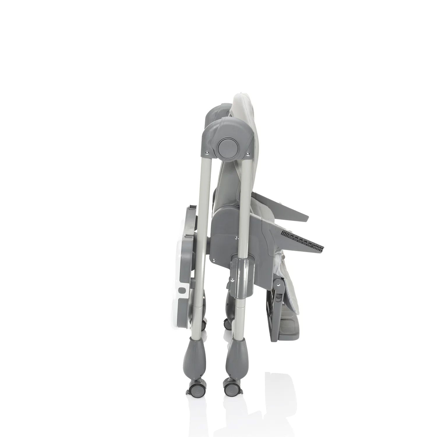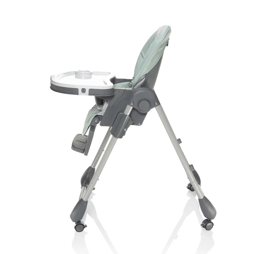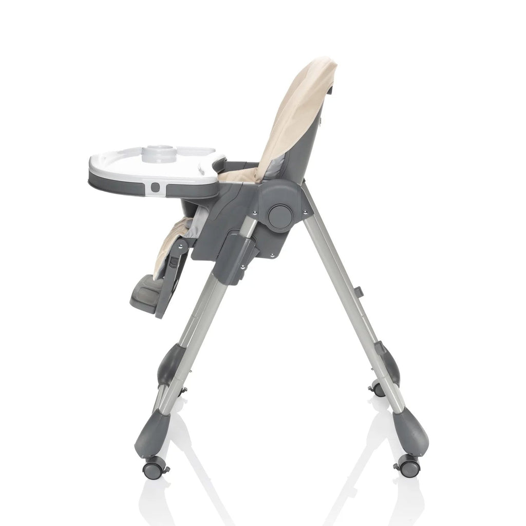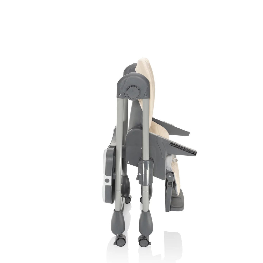 Der Hochstuhl lässt sich mühelos zusammenklappen und überzeugt durch seine kompakten Maße im gefalteten Zustand. Dank der Rollen mit Bremse kann er leicht bewegt und sicher abgestellt werden. Für zusätzlichen Komfort lässt sich das Tablett an der Rückseite des Stuhls einhängen, wenn es gerade nicht benötigt wird.