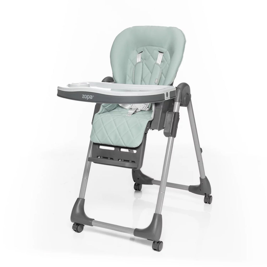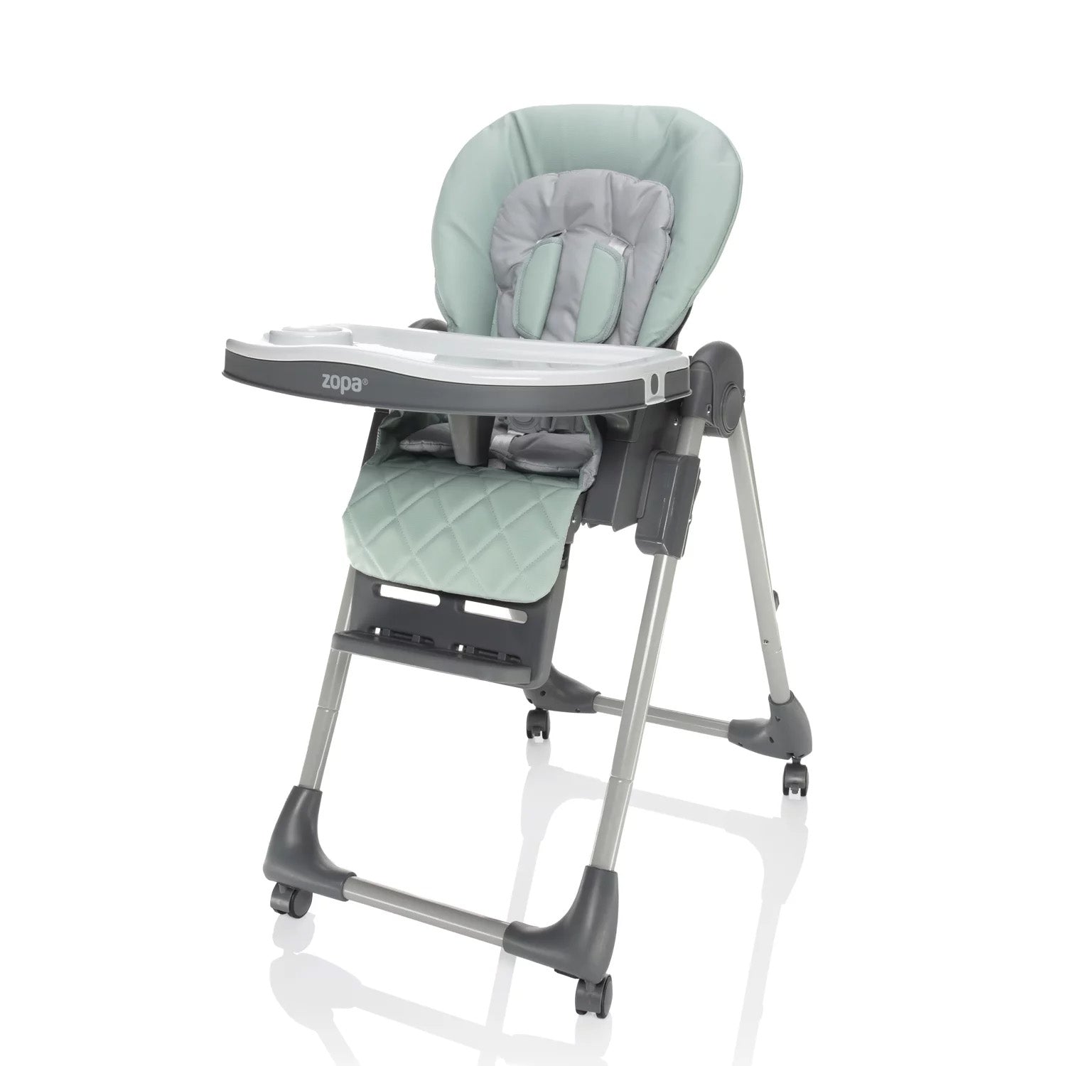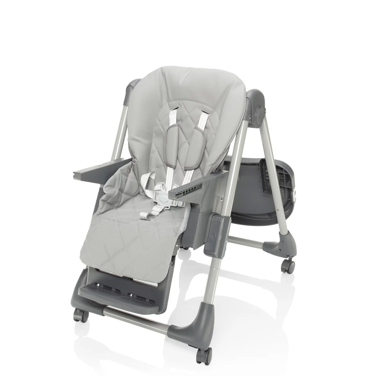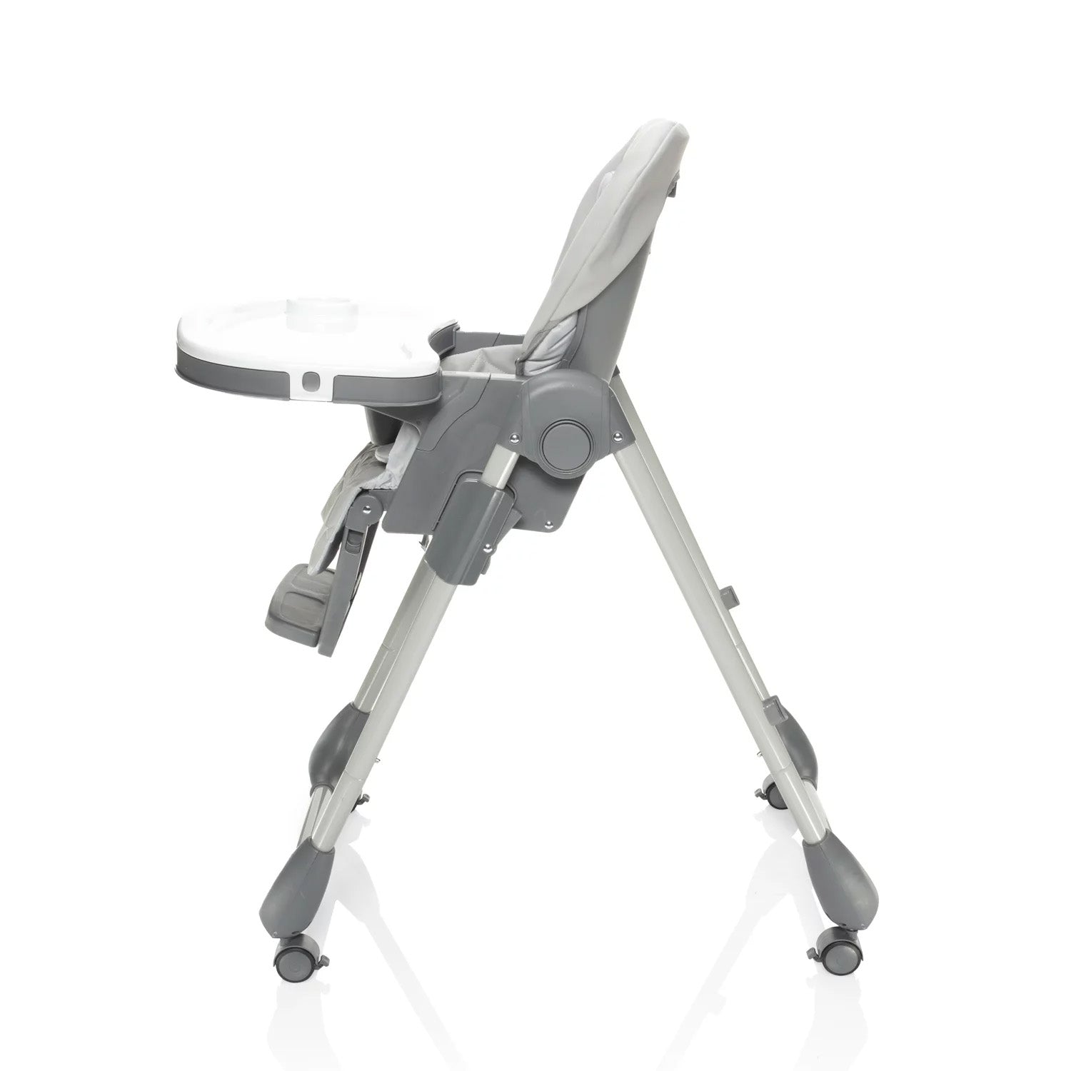 Der Hochstuhl lässt sich mühelos zusammenklappen und überzeugt durch seine kompakten Maße im gefalteten Zustand. Dank der Rollen mit Bremse kann er leicht bewegt und sicher abgestellt werden. Für zusätzlichen Komfort lässt sich das Tablett an der Rückseite des Stuhls einhängen, wenn es gerade nicht benötigt wird.