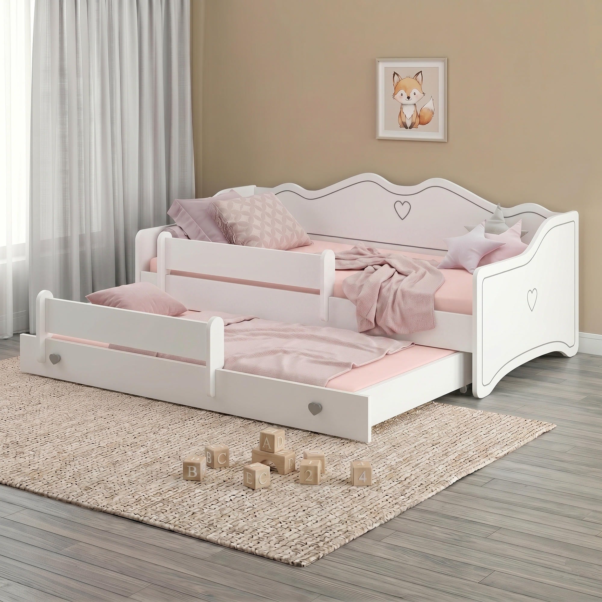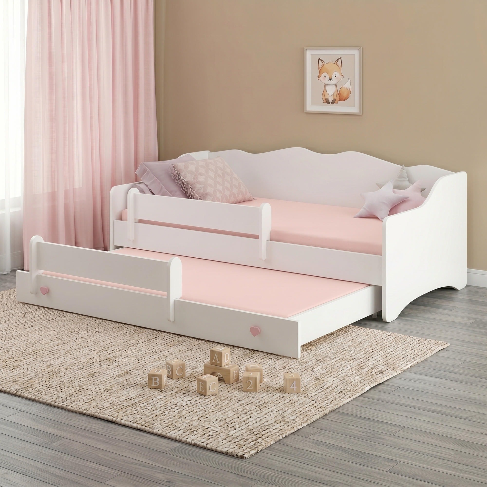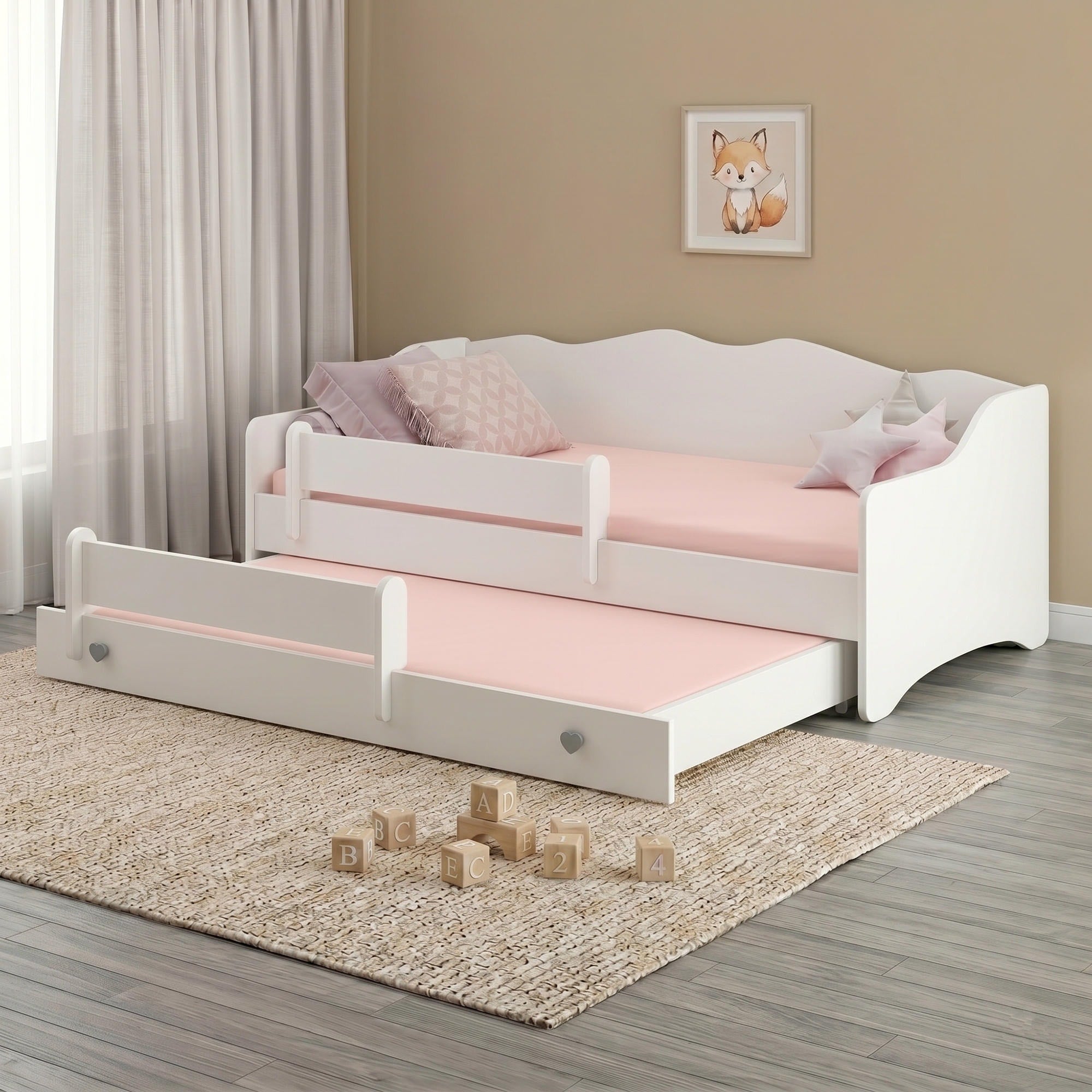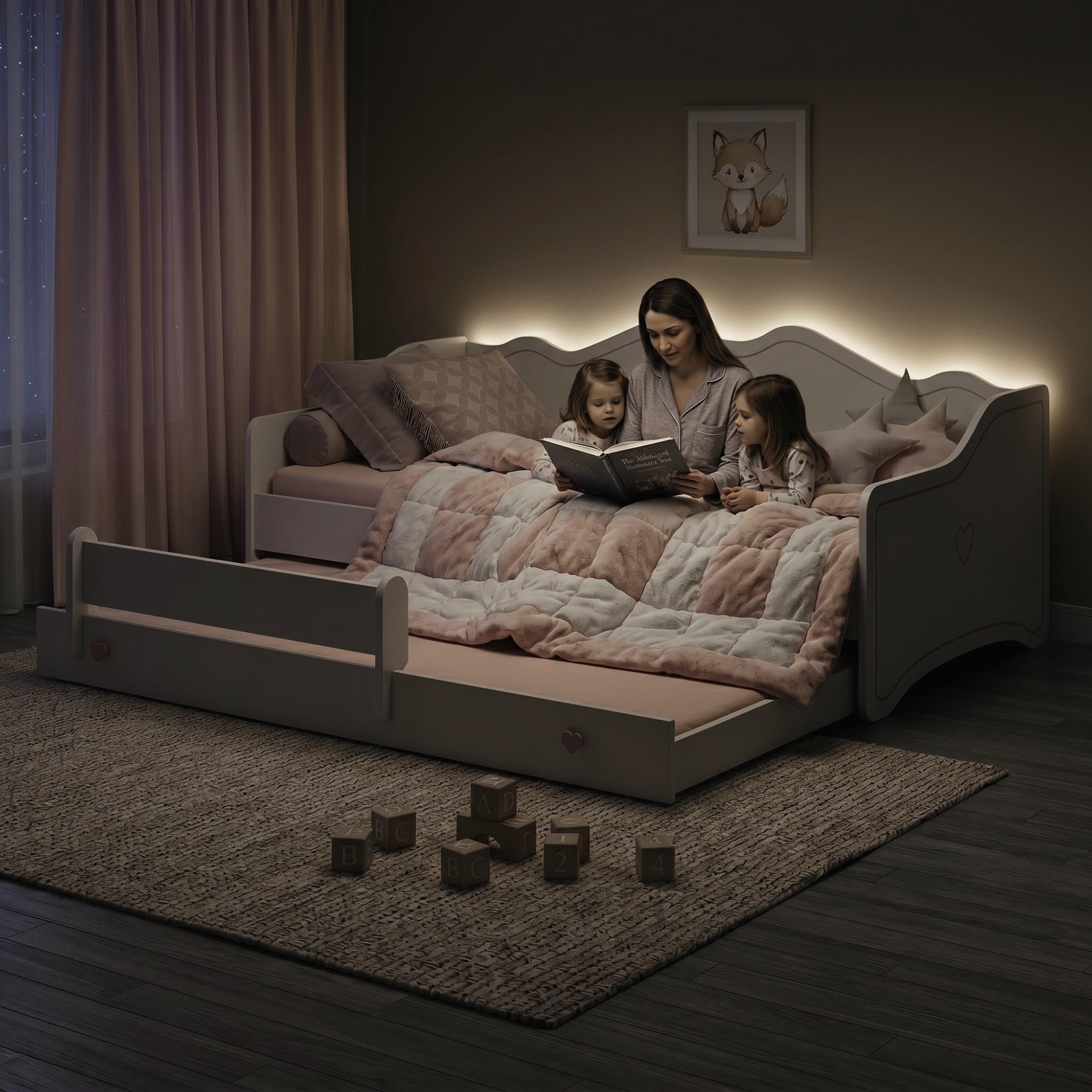 Das Kinderbett EMMA-MAX ist eine clevere Lösung für Kinderzimmer, in denen Komfort, Sicherheit und Platzersparnis wichtig sind. Das helle Design mit dekorativen Details und Griffen in Herzform verleiht dem Bett eine freundliche, gemütliche Optik und passt besonders gut in ein Mädchenzimmer.