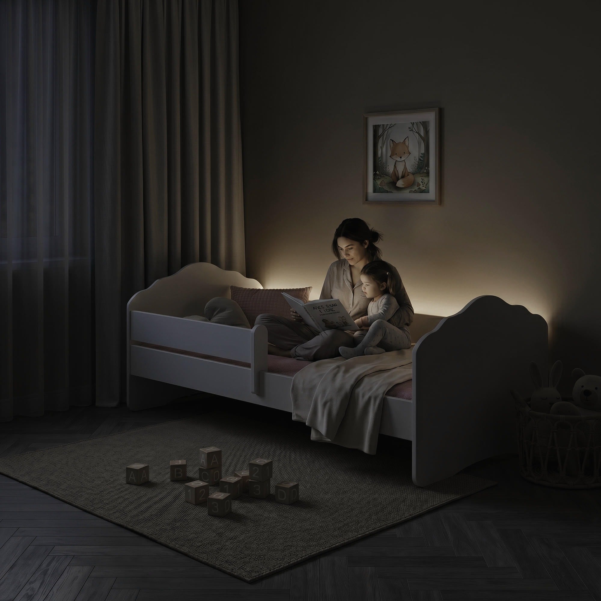 Erhöhte Seitenteile sorgen für mehr Sicherheit während des Schlafs. Zusätzlich ist eine Schutzbarriere enthalten, die je nach Bedarf rechts oder links montiert werden kann. So lässt sich das Bett flexibel an die Raumaufteilung anpassen.