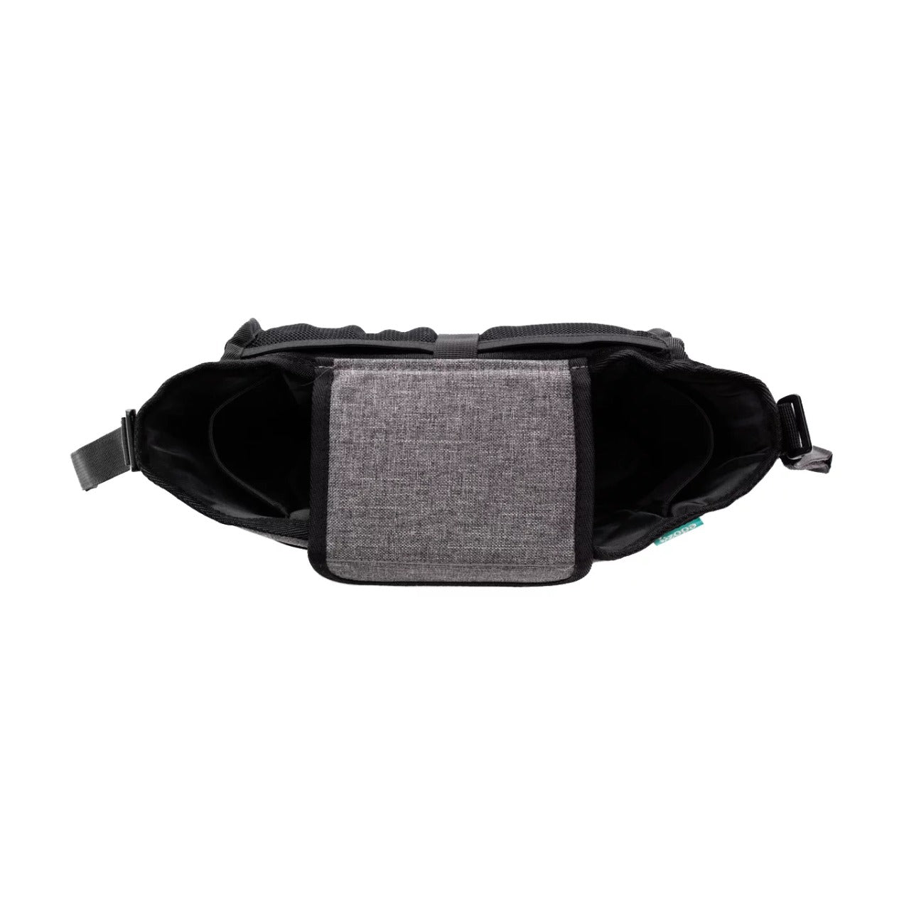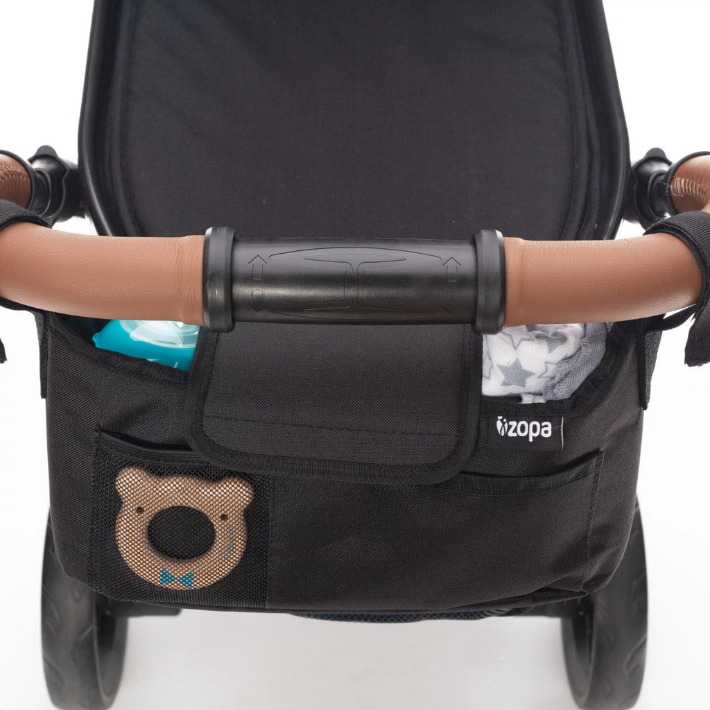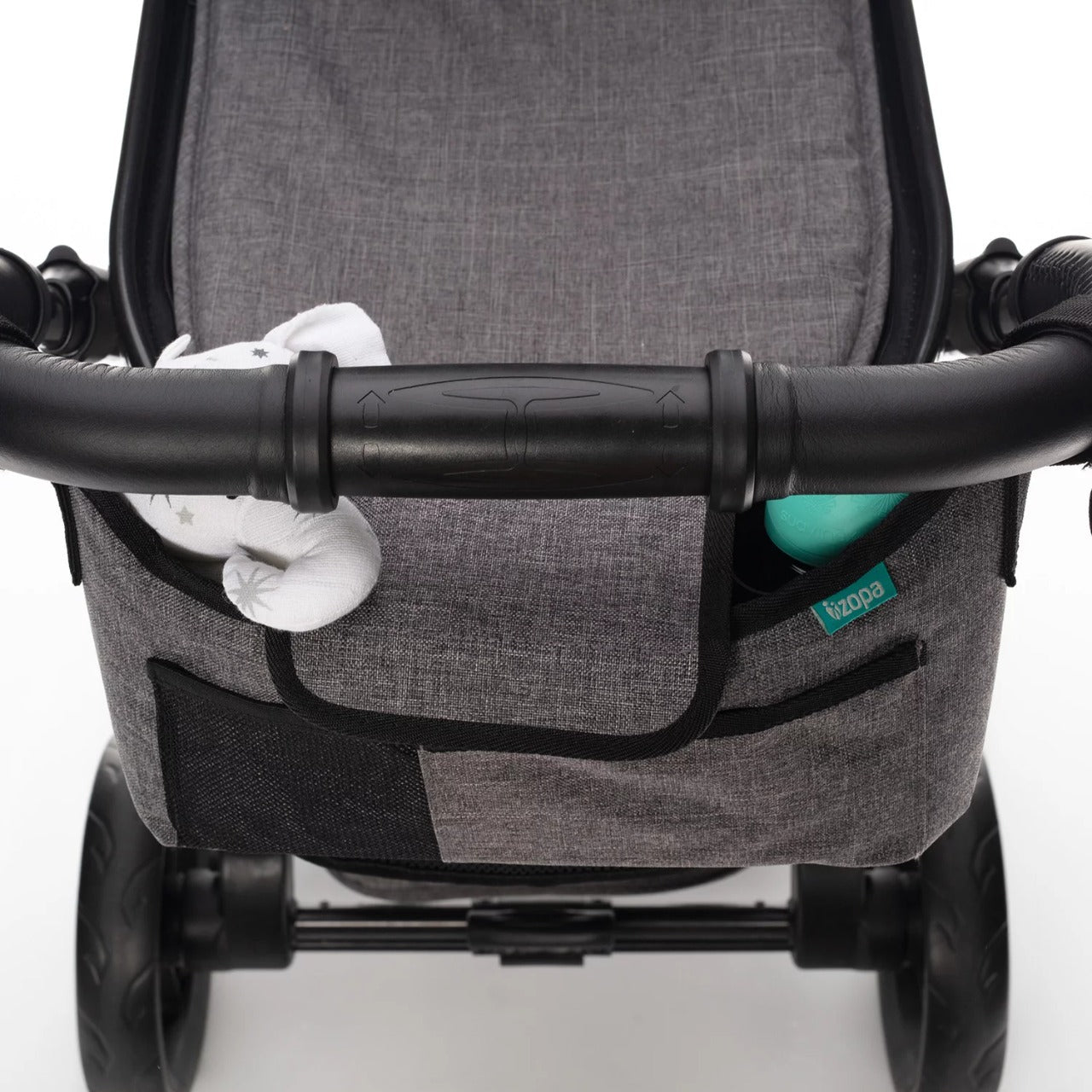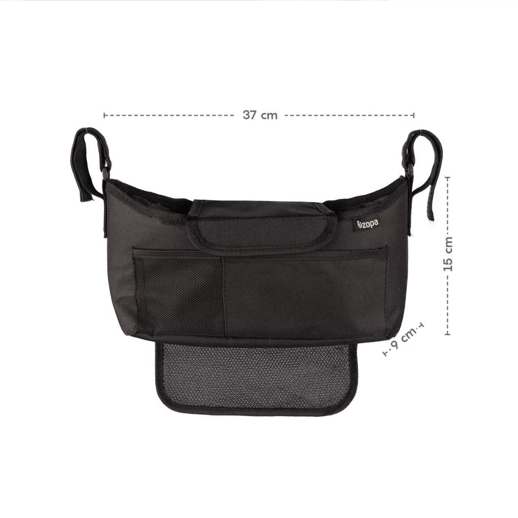 Der Organizer bietet großzügigen Stauraum und sechs Fächer für alle wichtigen Utensilien. Die Fronttasche verfügt über ein Netzfach für das Handy sowie einen Bereich für kleine Gegenstände. Auf der Rückseite befindet sich eine Netztasche, in die bequem eine Zeitschrift passt. Das Hauptfach ist so konzipiert, dass seitlich Flaschen untergebracht werden können. Befestigt wird der Organizer einfach am Kinderwagengriff mithilfe spezieller Haken mit Klettverschluss.