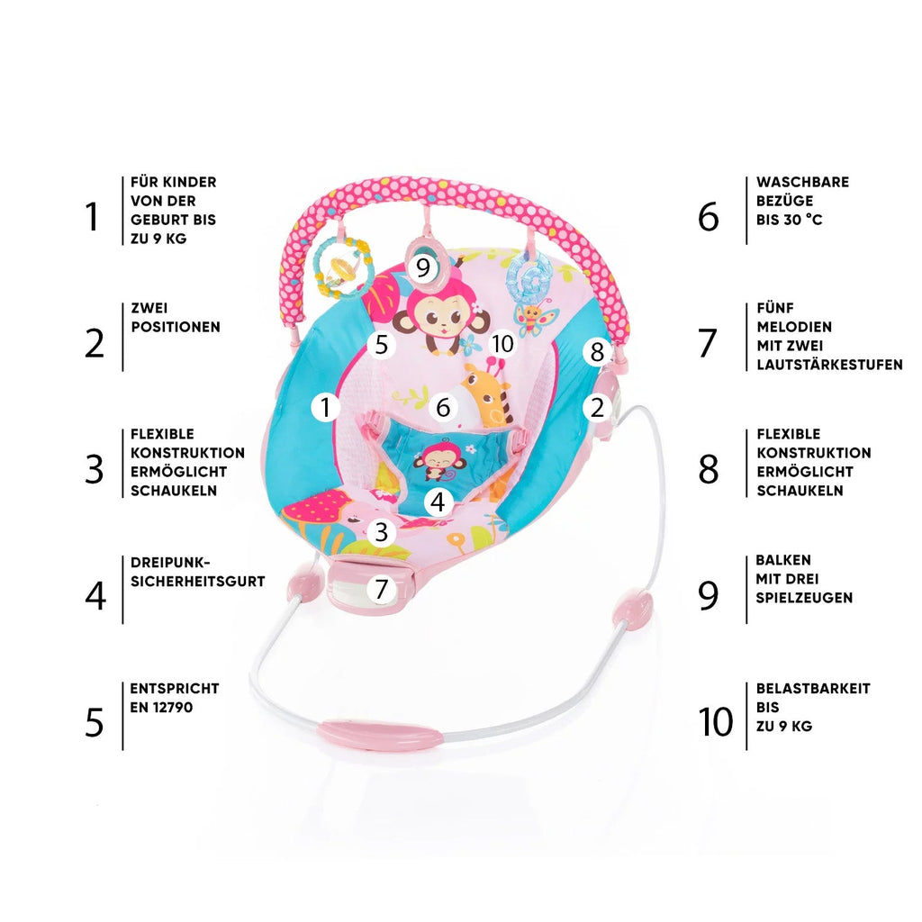 Verstellbar in 2 Positionen, Schaukelmodus, 3-Punkt-Sicherheitsgurt, Vibrationsfunktion, Spielstange mit Spielzeugen, 5 Melodien mit 2 Lautstärkestufen, Belastbarkeit 9 kg, erfüllt EN12790 – das ist die Babywippe Happy.