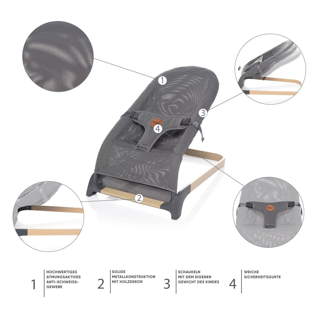 Die Wippe ist leicht und einfach zu transportieren. Das moderne Design mit Holzdekor fügt sich harmonisch in jedes Zuhause ein. Die Montage ist unkompliziert. Die Babywippe erfüllt die Sicherheitsnorm EN 12790.